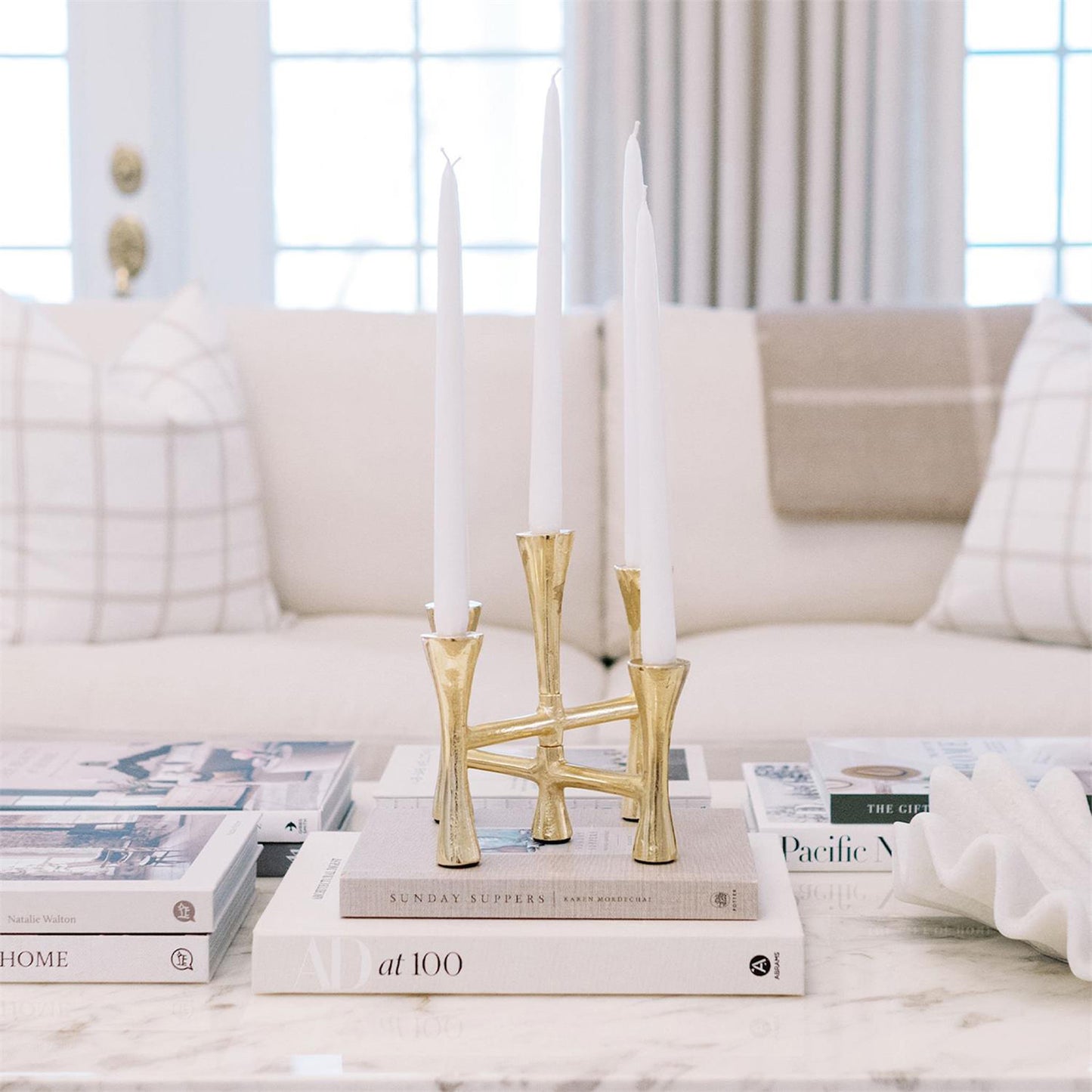 Expertly constructed from durable aluminum, our gorgeous Golden Taper Candleholder holds up to 5 tapered candles. Its elegant gold-tone finish adds a touch of sophistication to any space, making it perfect for indoor use.